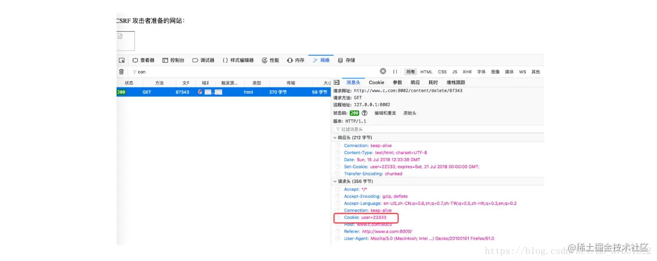 如发起 www.c.com:8002/content/del… 请求时,会删除 id 为 87343 的帖子。当用户登录之后,会设置如下 cookie: