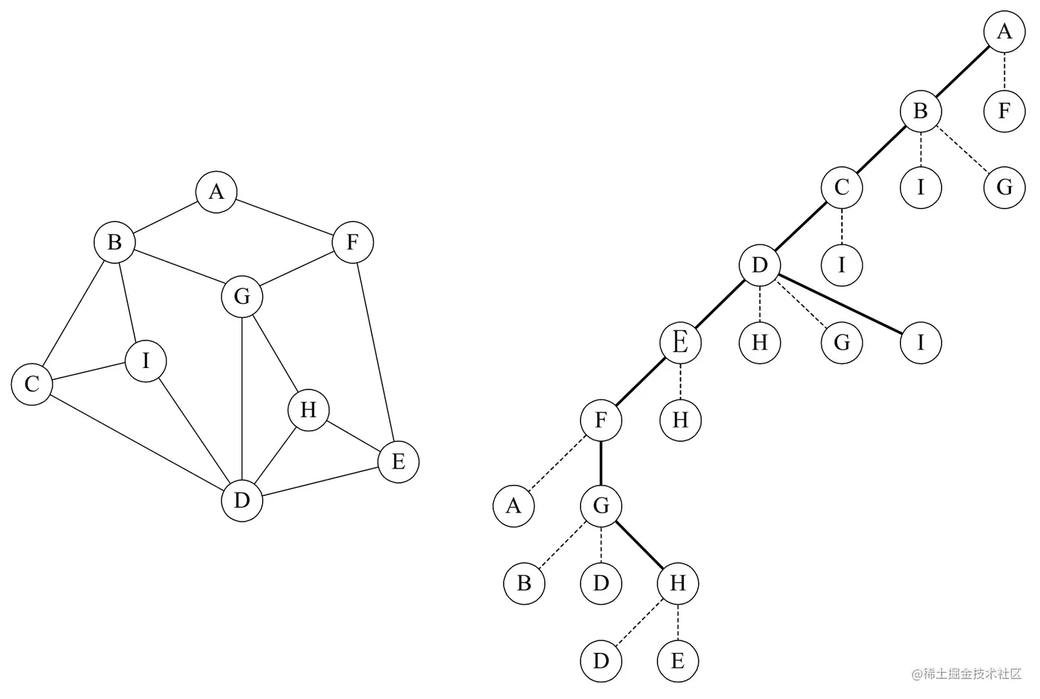 首先我们从顶点A开始,做上表示走过的记号后,面前有两条路,通向B和F,我们给自己定一个原则,在没有碰到重复顶点的情况下,始终是向右手边走,于是走到了B顶点。整个行路过程,可参看图7-5-2的右图。此时发现有三条分支,分别通向顶点C、I、G,右手通行原则,使得我们走到了C顶点。就这样,我们一直顺着右手通道走,一直走到F顶点。当我们依然选择右手通道走过去后,发现走回到顶点A了,因为在这里做了记号表示已经走过。此时我们退回到顶点F,走向从右数的第二条通道,到了G顶点,它有三条通道,发现B和D都已经是走过的,于是走到H,当我们面对通向H的两条通道D和E时,会发现都已经走过了。