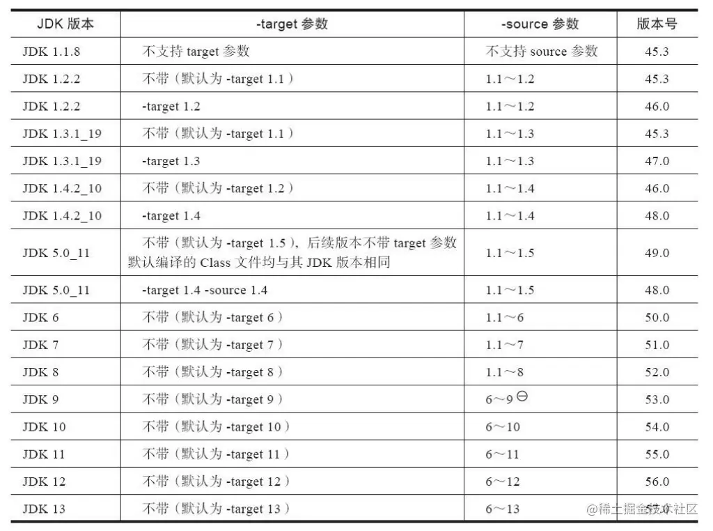 例如,JDK 1.1能支持版本号为45.0~45.65535的Class文件,无法执行版本号为46.0以上的Class文件,而JDK 1.2则能支持45.0~46.65535的Class文件。目前最新的JDK版本为13,可生成的Class文件主版本号最大值为57.0。
