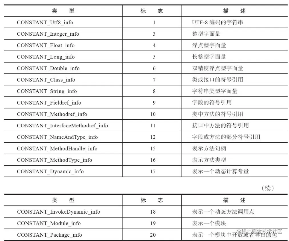 常量池的每一个常量都是一个表,最初只有11种结构,后来扩展出4种和动态语言相关的常量,为了模块化:加入CONSTANT_Module_info和CONSTANT_Package_info两个常量,最终就是11+4+2 = 17种常量,所以到JDK16版本为止有17种常量。同意,记是记不住的,我们也不需要记住: