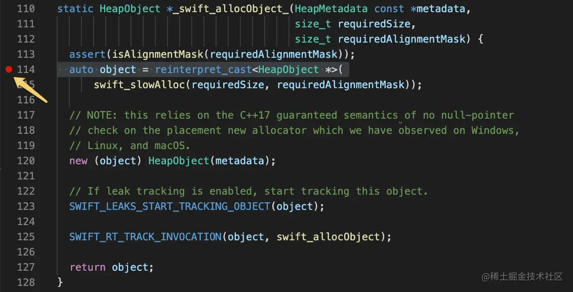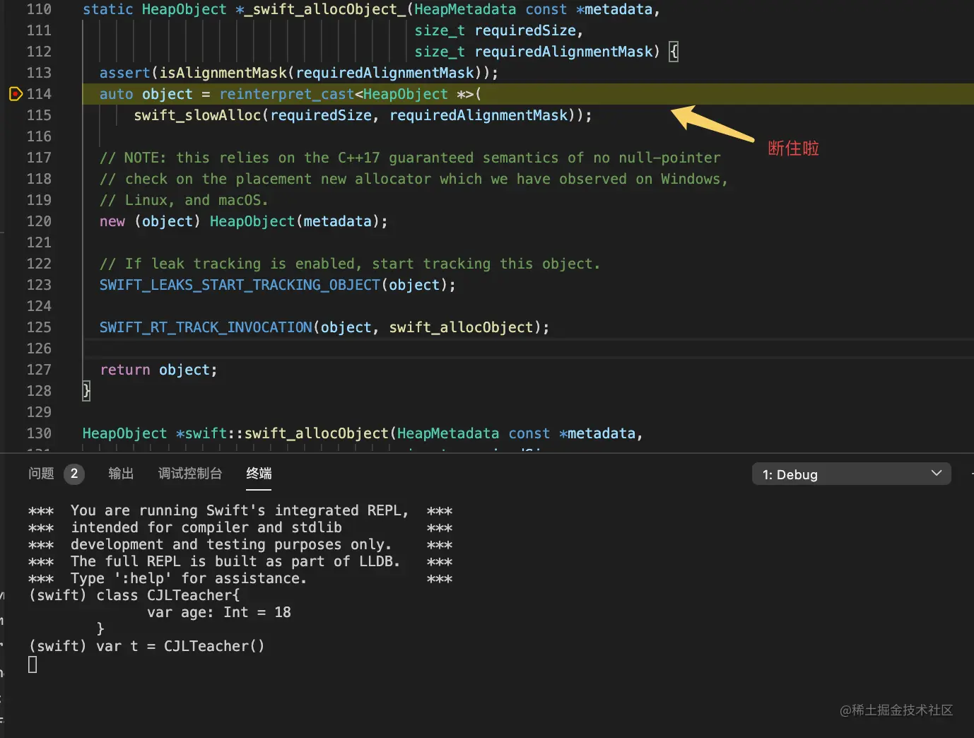 swift_allocObject(这个在后面文章会讲解,仅作为调试的例子),加上断点 - 继续在终端输入