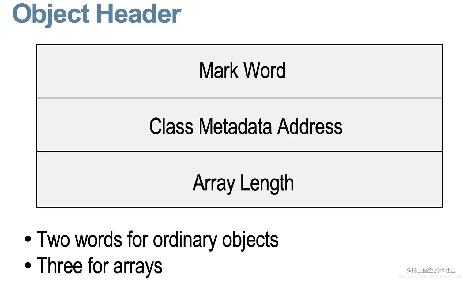 首先对于普通对象来说拥有前两者MarkWord,Class Metadata Address.对于数组对象来说会有数组长度来标识数组的长度.