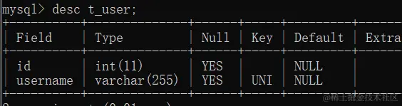 注意 : 查看表结构的时候发现,表结构中的username中的Key字段有UNI关键字,说明这个字段的值不能重复。