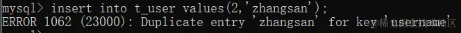 - 因为在建表的时候username字段加入了约束条件,该字段的值不能重复。