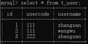 insert into t_user values(1,'111','zhangsan'); insert into t_user values(2,'111','wangwu'); insert into t_user values(3,'222','zhangsan');