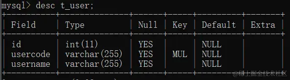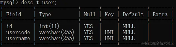 - 而后来两行数据中,usercode与username的字段值其中有一个字段是重复的,报错 第三步 :查看表的结构