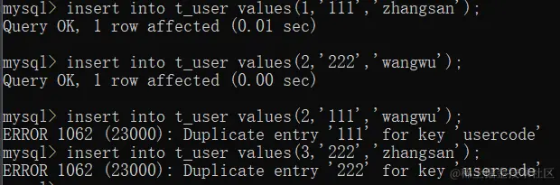 注意:此时会报错(usercode”键的重复条目“111 zhangsan),因为插入的数据与第一次插入的数据usercode字段值和username字段值都一样.