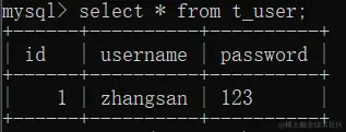 insert into t_user(id,username,password) values(1,'zhangsan','123');