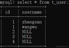 第一步 :插入数据,不给定username的值,默认值为NULL(空)