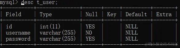 查看表的结构可以发现,在username字段的NULL为NO,说明username必须有值,不能为null