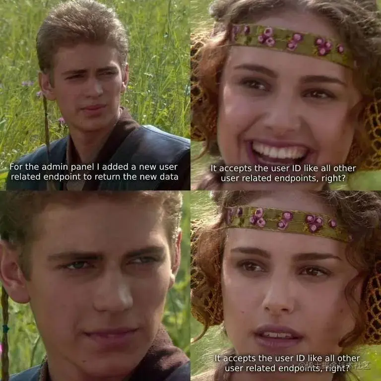 当然,你也可以在所有函数中都接受不同形状的参数。拿上面这张梗图为例,让一些函数接受用户 ID,另一些则在完全可以只用用户 ID 的情况下接受整个用户对象。或许你还可以找到些接受用户电邮地址的方法?接手你代码的家伙要面临的可就是地狱啊。