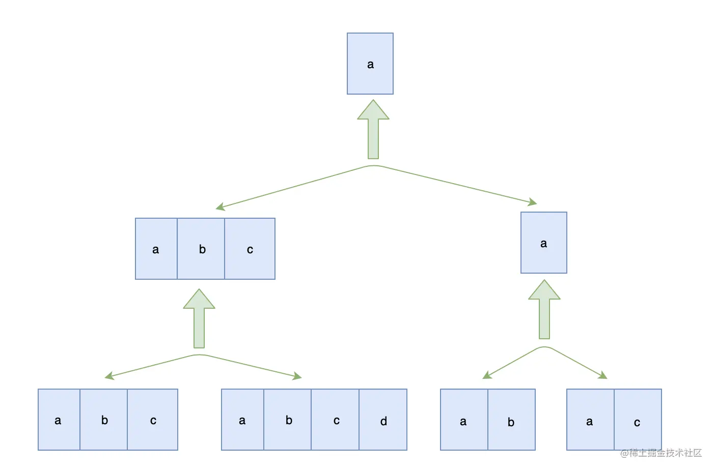 - 原问题的解为子问题解的合并:多个字符串的最长公共前缀为两两字符串的最长公共前缀的最长公共前缀,我们可以归并比较两最长公共前缀字符串的最长公共前缀,知道最后归并比较成一个,则为字符串数组的最长公共前缀: