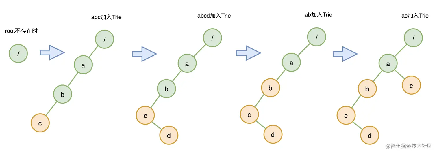构建一个 Trie 树,以 abc 、 abcd 、ab 、ac 为例: