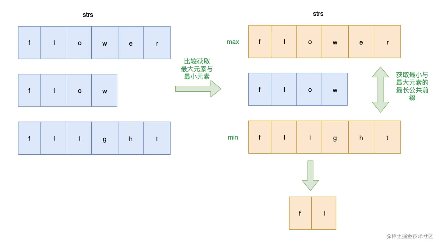 例如 abc 、 abcd 、ab 、ac ,最小 ab 与最大 ac 的最长公共前缀一定也是 abc 、 abcd 的公共前缀