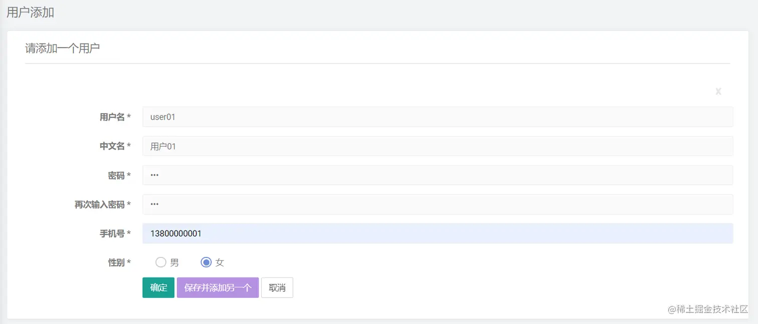 - 添加用户按钮:通过页面表单方式实现用户添加;