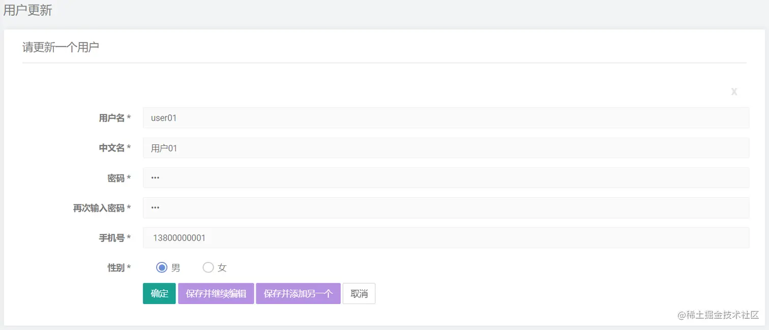 说明:用户新增和用户修改使用的是同一个模板,里面通过