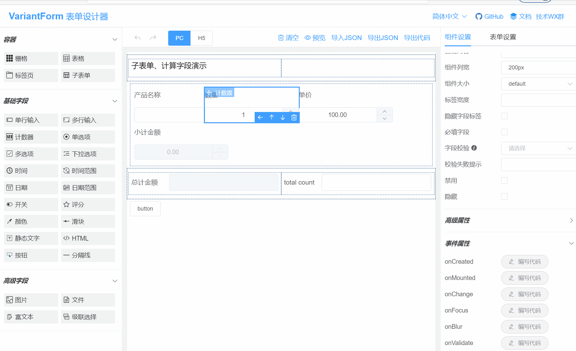 为了解决第二个问题,如何实现动态表单的复杂交互逻辑,也是本文的主要目标,本文的解决思路是——为动态表单增加可编程接口,即通过组件的交互事件和API方法实现交互逻辑,JS代码才是王道。