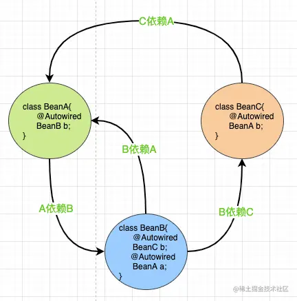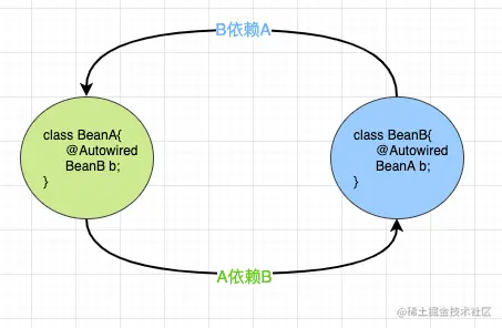 A类依赖了B类, 同时B类有依赖了A类. 这就是循环依赖, 形成了一个闭环
