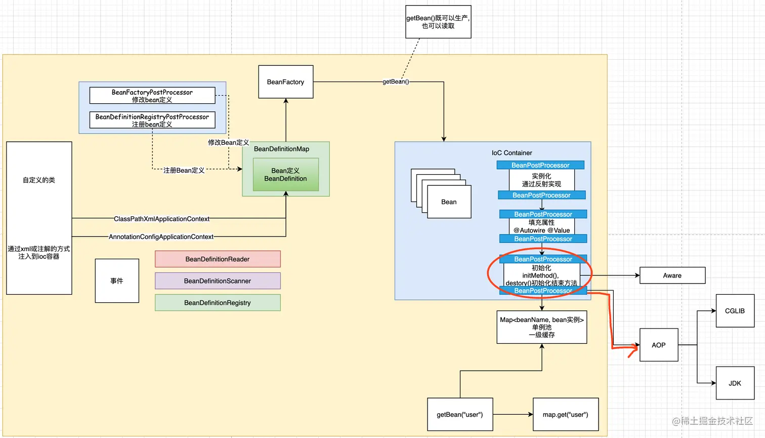 如上图. 我们在创建bean 的时候, 会有很多Bean的后置处理器BeanPostProcessor. 如果有AOP, 会在什么时候创建呢? 在初始化以后, 调用BeanPostProcessor创建动态代理.
