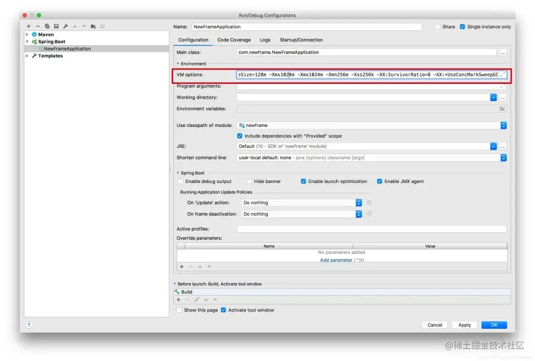 $ java -jar -XX:MetaspaceSize=128m -XX:MaxMetaspaceSize=128m -Xms1024m -Xmx1024m -Xmn256m -Xss256k -XX:SurvivorRatio=8 -XX:+UseConcMarkSweepGC newframe-1.0.0.jar