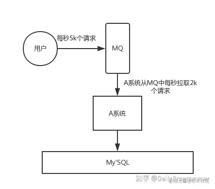 如果使用 MQ,每秒 5k 个请求写入 MQ,A 系统每秒钟最多处理 2k 个请求,因为 MySQL 每秒钟最多处理 2k 个。A 系统从 MQ 中慢慢拉取请求,每秒钟就拉取 2k 个请求,不要超过自己每秒能处理的最大请求数量就 ok,这样下来,哪怕是高峰期的时候,A 系统也绝对不会挂掉。而 MQ 每秒钟 5k 个请求进来,就 2k 个请求出去,结果就导致在中午高峰期(1 个小时),可能有几十万甚至几百万的请求积压在 MQ 中。