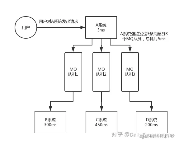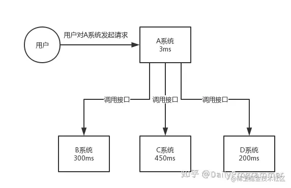再来看一个场景,A 系统接收一个请求,需要在自己本地写库,还需要在 BCD 三个系统写库,自己本地写库要 3ms,BCD 三个系统分别写库要 300ms、450ms、200ms。最终请求总延时是 3 + 300 + 450 + 200 = 953ms,接近 1s,用户感觉搞个什么东西,慢死了慢死了。用户通过浏览器发起请求,等待个 1s,这几乎是不可接受的。