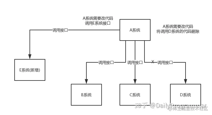 看这么个场景。A 系统发送数据到 BCD 三个系统,通过接口调用发送。如果 E 系统也要这个数据呢?那如果 C 系统现在不需要了呢?A 系统负责人几乎崩溃......