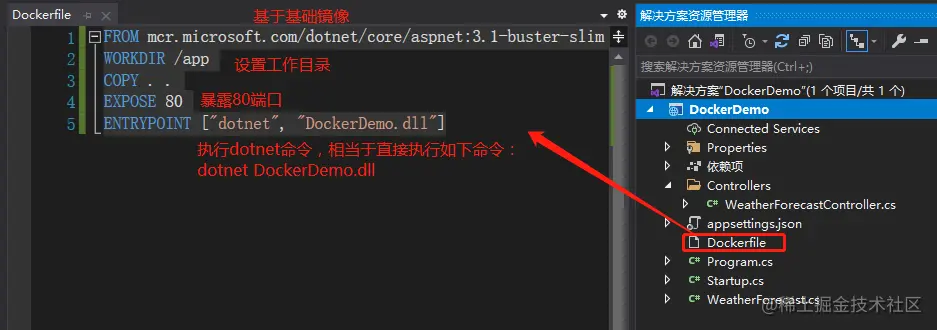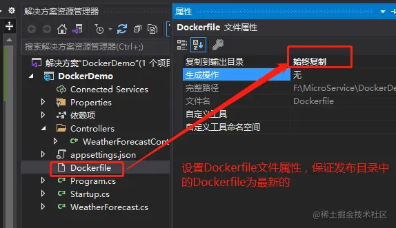 FROM mcr.microsoft.com/dotnet/core/aspnet:3.1-buster-slim WORKDIR /app COPY . . EXPOSE 80 ENTRYPOINT ["dotnet", "DockerDemo.dll"]设置Dockerfile的文件属性为始终复制,如下: