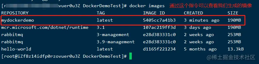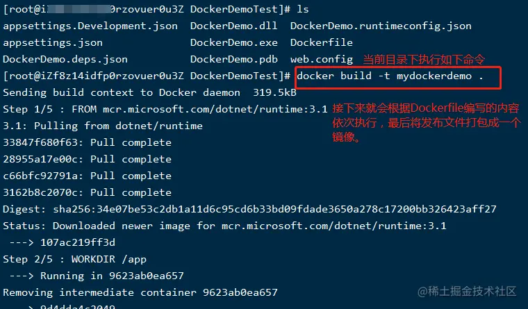 docker build命令,将发布文件打包为一个镜像,如下:上图中的mydockerdemo 是镜像名,可以自定义;通过