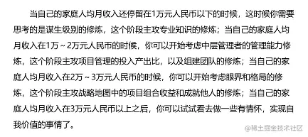 如果你入行第一年的年收入是年薪5万元的话,在还没有到年薪5万~15万元阶段,认真磨炼专业知识就可以了;当你的年薪在15万~45万元阶段,请认真磨炼项目管理相关的管理层知识体系即可;当你的年薪在45万~135万元阶段的时候,你得开始往决策层的思维模式转变