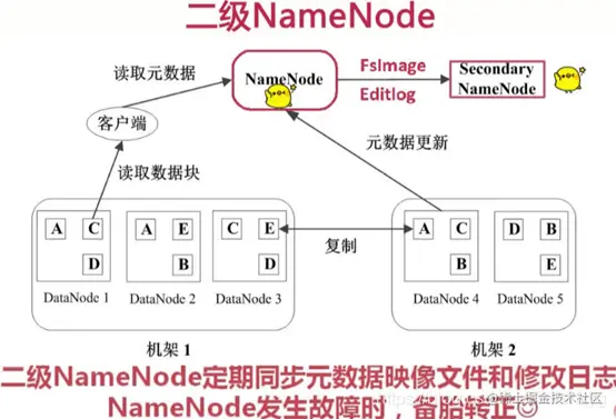 3.secondary namenode;定期同步元数据映像文件和修改日志,namenode发生故障,secondaryname是冷备份,不会马上上位,减少损失而已。