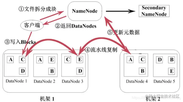 2、文件分块存储,HDFS会将一个完整的大文件平均分块存储到不同计算机上,它的意义在于读取文件时可以同时从多个主机取不同区块的文件,多主机读取比单主机读取效率要高得多得多。