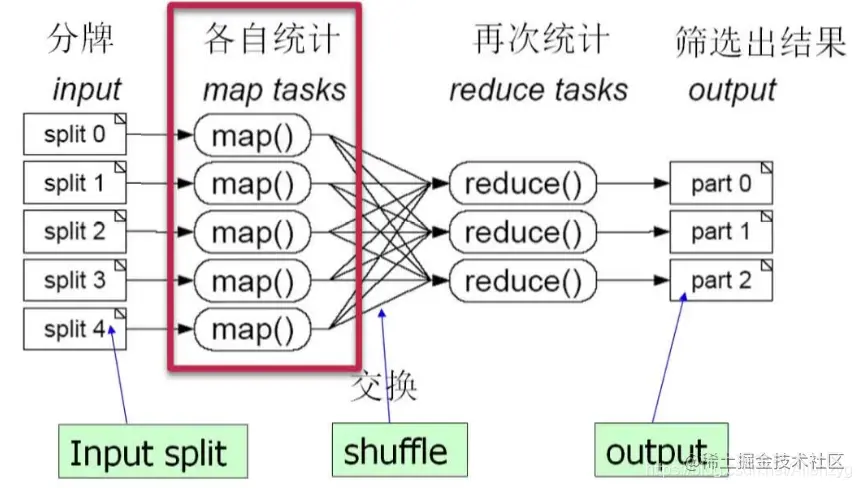 分而治之,一个大任务分成多个子任务(map),并行执行之后,合并结果(reduce)。