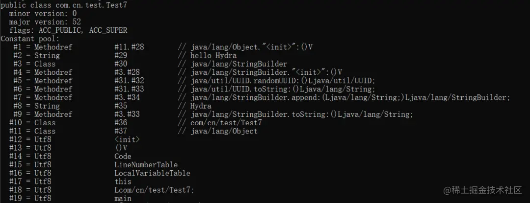 编译器能够在编译期就得到s1的值是hello Hydra,不需要等到程序的运行期间,因此s1属于编译期常量。而对s2来说,虽然也被声明为final类型,并且在声明时就已经初始化,但使用的不是常量表达式,因此不属于编译期常量,这一类型的常量被称为运行时常量。再看一下编译后的字节码文件中的常量池区域:
