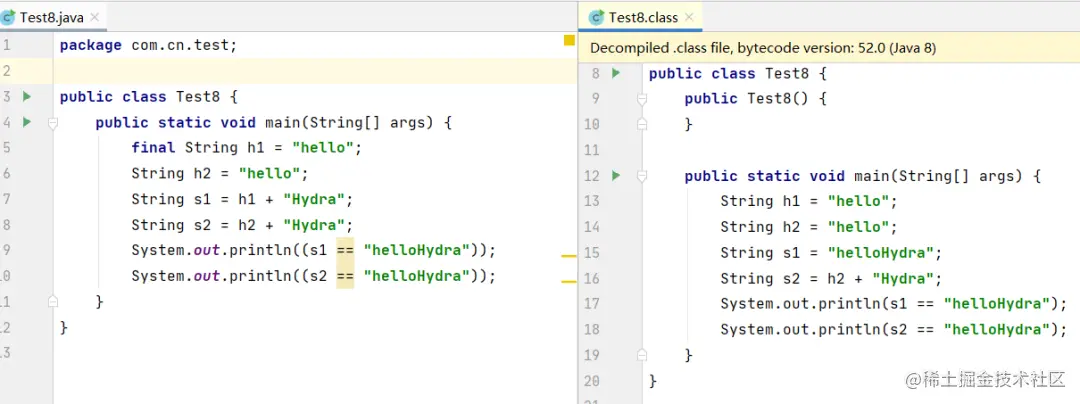 代码中字符串h1和h2都使用常量赋值,区别在于是否使用了final进行修饰,对比编译后的代码,s1进行了折叠而s2没有,可以印证上面的理论,final修饰的字符串变量属于编译期常量。