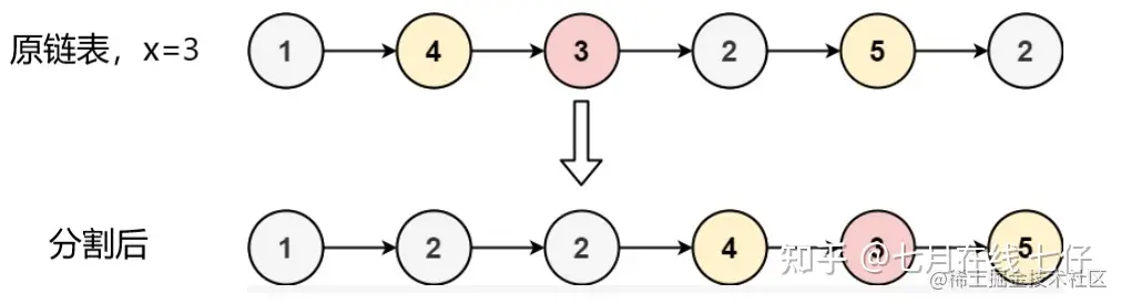 给定一个链表的头节点 head 和一个特定值 x ,然后对链表进行分隔,使得所有小于x的节点都出现在大于或等于x的节点之前。同时保留两个分区中每个节点的初始相对位置。