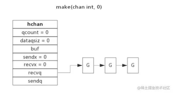 如下图,为没有缓冲区的 channel,recvq 中有几个 goroutine 阻塞等待读数据。