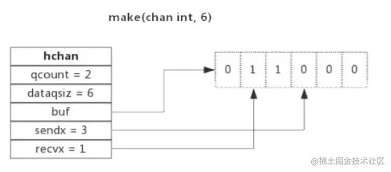 如下图,我们创建一个可缓存6个元素的 channel 示意图: