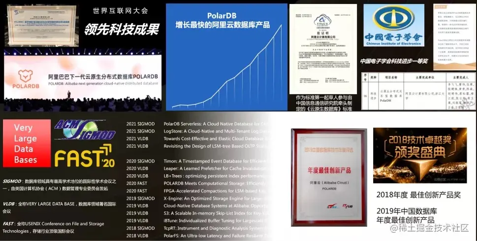 目前,PolarDB在业界受到非常广泛的认可,顶级学会的论文已经超过了10篇了,获得了今年中国电子学会的科技进步一等奖,还有一些其他权威荣誉。