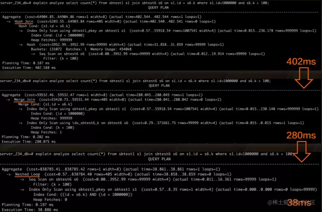 可以看到,在上面这个案例中,选择nest-loop join是最快的。