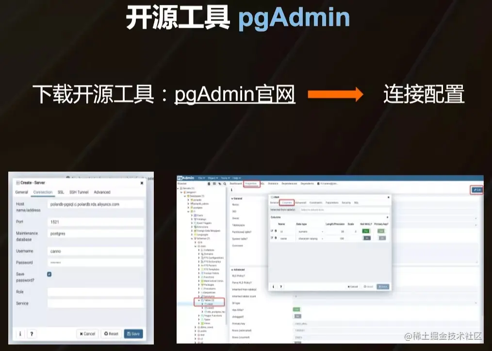 第二个是用开源的数据管理平台叫pgAdmin,在这个平台上可以做基本的数据管理操作,包括基础信息的查看,数据查询,看一些执行计划、表、对象等,如下所示。