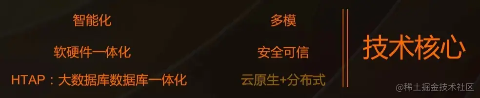 六大核心技术分别是智能化、多模、软硬件一体化、安全可信、HTAP:大数据库数据库一体化、云原生+分布式。这六大核心技术支撑了上文的产品能力,解决开发者诉求。