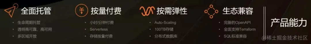 在这些客户诉求下,我们思考下一代数据库或者说新的数据库要具备哪些特性,也就是云原生数据库它所具备的产品能力,如下所示。