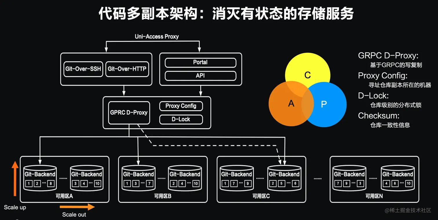 1、可用性提升:多写和随机读让底层的git存储服务不存在写单点和failover的切换问题;