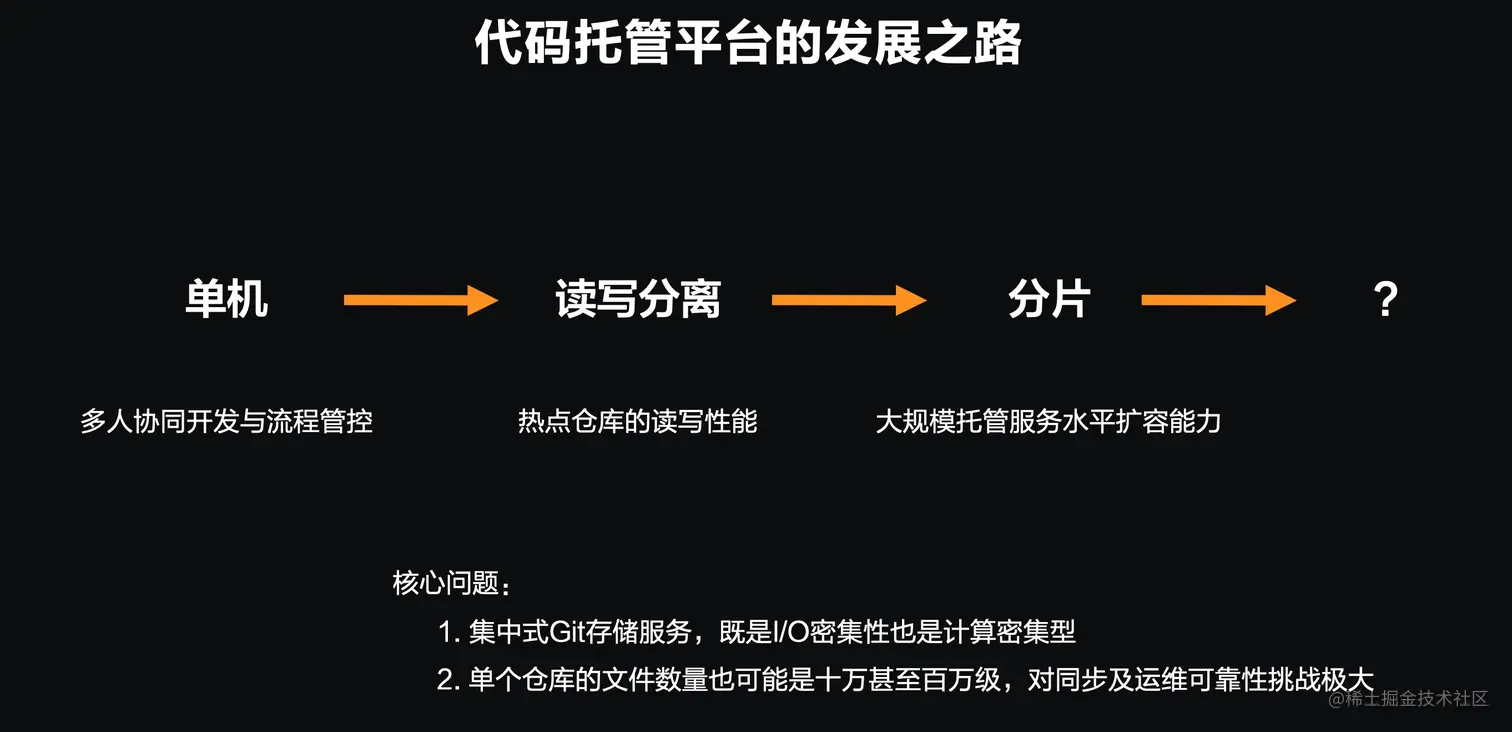 实际上,代码平台架构的发展,就是在这两个问题之间找平衡,以在一定规模情况下保证整个平台的稳定性。但一直没有根本性地解决掉这两个问题。然而随着规模逐步上涨,上述的两个核心问题引发的劣势又逐步变得明显起来。