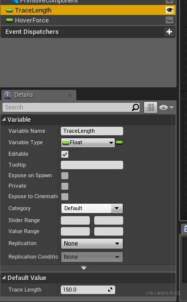 接下来是编写蓝图逻辑之前的工作:创建两个 Float 变量,命名为 TraceLength 和 HoverForce ,
