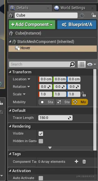 在关卡中创建一个 Cube 或者 Sphere 静态物体组件,选中后在 Detail 面板中添加上文中制作完成的HoverComponent ,将物体的移动属性改为 Movable ,将静态物体组件放置到场景中,运行关卡,进行测试,可以在 Default 中更改 TraceLength 的值查看效果