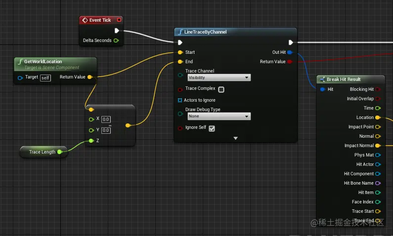 然后调用 Event Tick 事件,在游戏的每一帧进行射线检测,检测的方向 为物体的 Z 轴方向,幅度 则为之前设置的 TraceLength