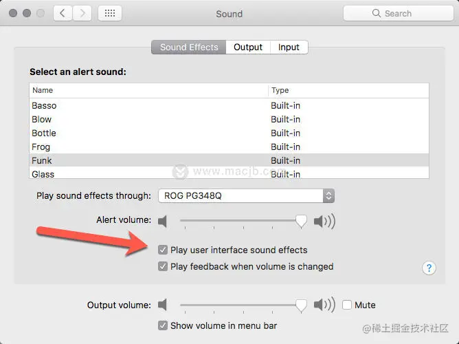 截图提示音是可以关闭的,大家只需要打开 System Preferences,然后选择 Sound (声音),然后只要把红色箭头指的这个关掉就行:
