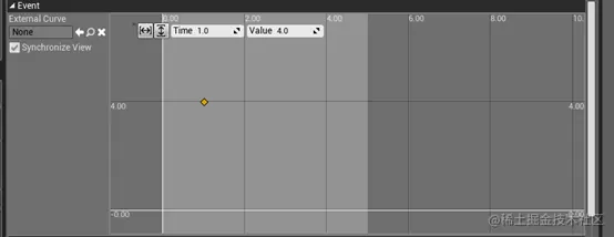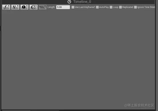 左上角的 4 个按钮 分别对应 4 种时间轨迹,第一个是浮点型轨迹,作用比较单一,用于调整数值的大小,比较常见的功能 —— 比如,制作一个随时间变化的浮点数值曲线。例如,一名角色在受伤状态下的生命值不是均匀减少的,而是随时间减少地越来越快,就可以用浮点曲线做到。